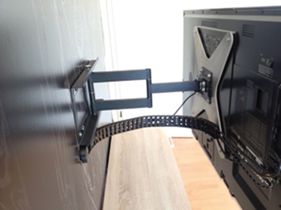 This wall bracket allows the TV set to be swivelled through 120 degrees. Up to now, cables simply hung loosely and became tangled after several swivelling movements, causing the cables to break. This problem has now been solved using an igus® e-chain®: network cable, HDMI cable, internet cable and a fibre optic cable are now guided perfectly. Positive side effect: the cables are invisible even when the TV is set extended.